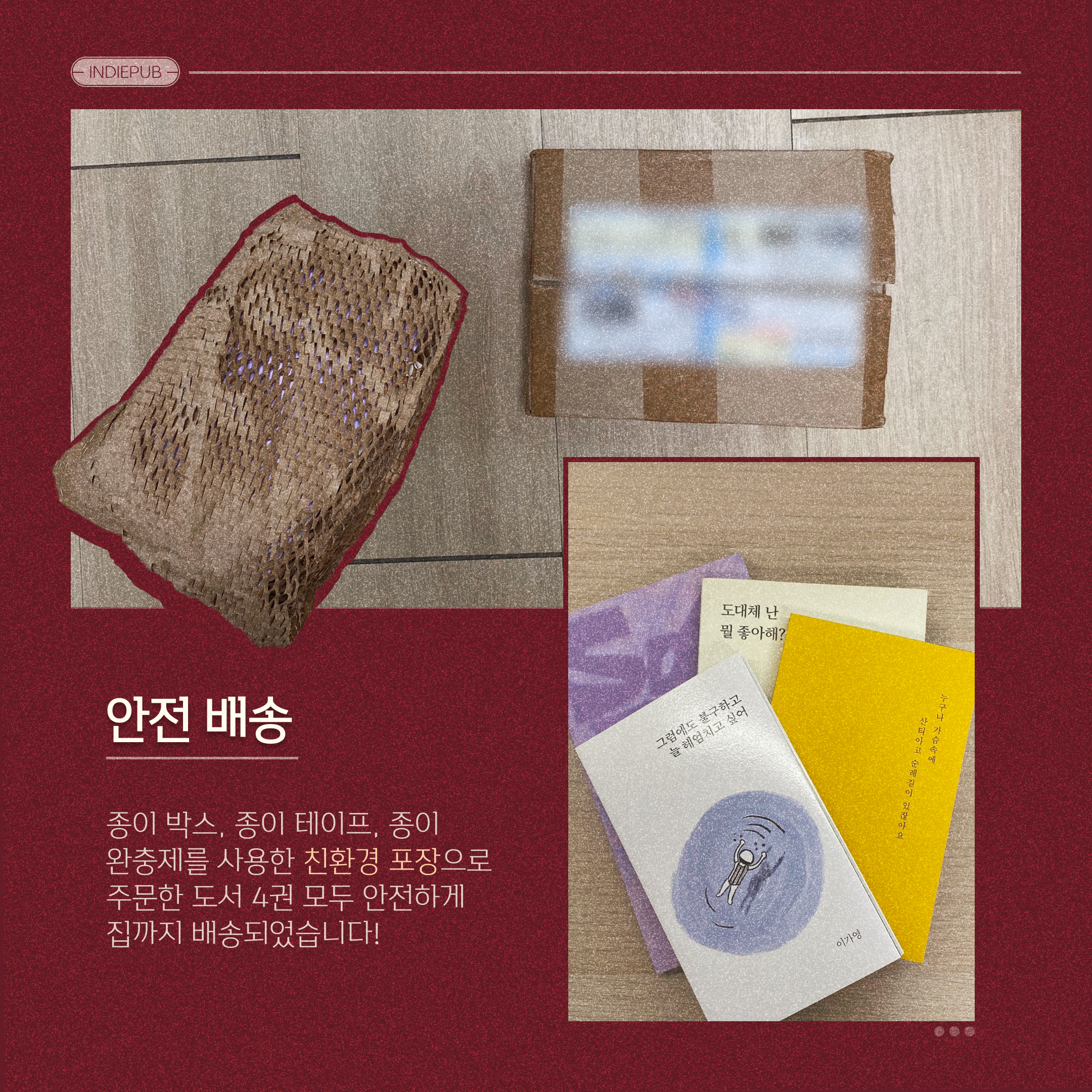 일반적으로 택배를 떠올리면 비닐, 에어캡(=뽁뽁이) 그리고 일반 테이프가 사용되는 경우가 많죠. 그러나 인디펍에서는 환경을 생각해 종이를 활용한 포장을 택했다는 점이 정말 마음에 들었습니다. 특히 종이 테이프 덕분에 택배를 뜯기가 훨씬 편리했고, 종이 완충재도제 역할을 톡톡히 해내어 책이 안전하게 저희 집에 도착할 수 있었어요!