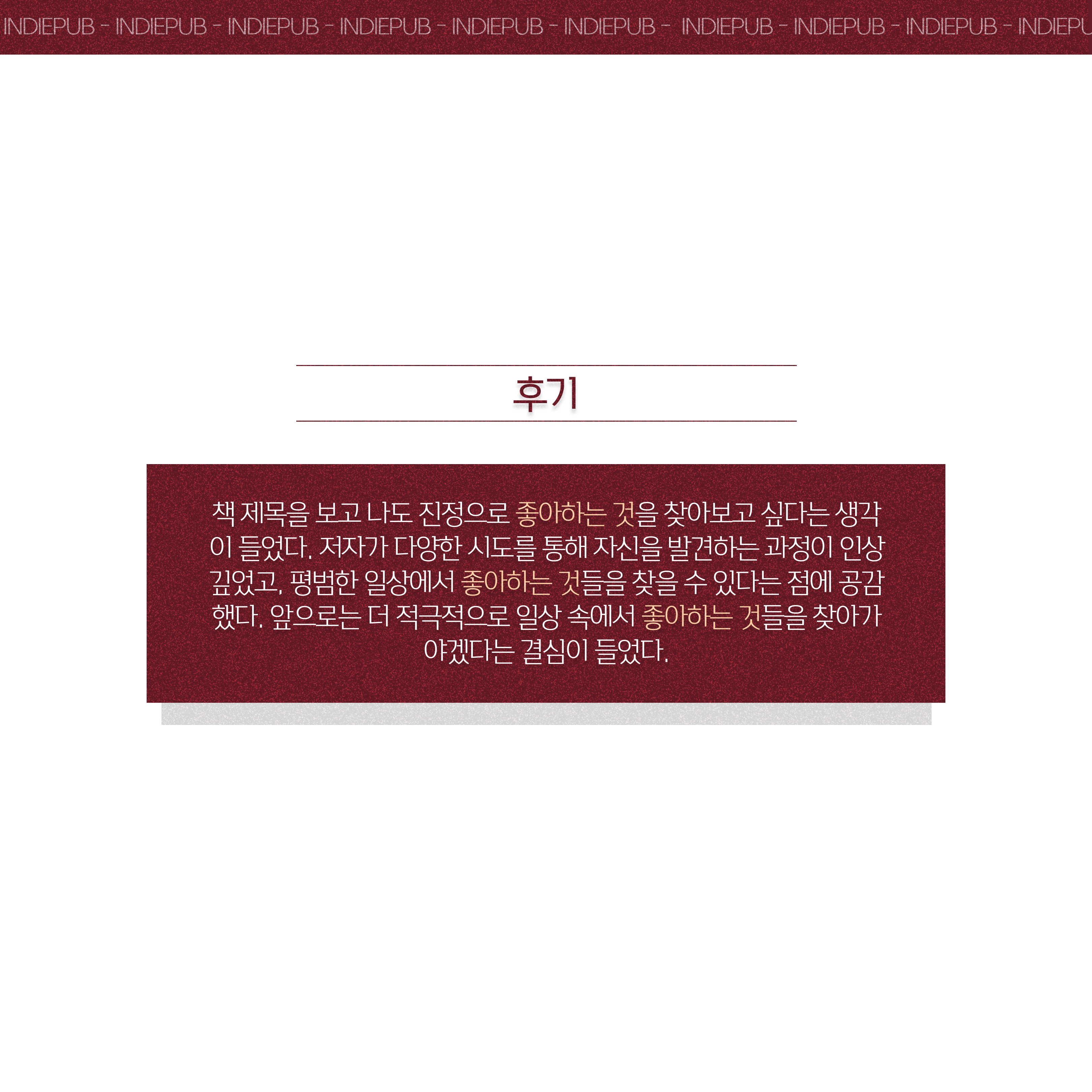 내가 좋아하는 것이 없다는 건 이상한게 아니구나. 애초에 좋아하는 것은 노력해야 얻을 수 있는 거였어. 좋아하는 것을 찾는 건 역시 어려운 거야. 다행이다. 라는 생각과 함께 우연히 책에서 이문장을 발견한 순간이 마치 선물을 받은 기분이었다.
