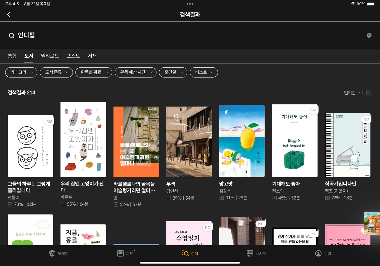 실제로 저희 엄마께서 2022년부터 밀리의 서재를 구독하고 계셔서, 저도 함께 아이패드를 기기 등록하여 이동 중이나 잠시 머무를 때 자주 전자책을 읽곤 합니다. 하지만 인디펍에 대해 알기 전까지는 밀리의 서재에 독립출판 카테고리가 따로 있다는 사실을 몰랐습니다. 이번 서포터즈 활동을 계기로 정말 좋은 정보도 알게 되었고, 서포터즈가 끝나고 독립출판물을 전자책으로 읽어볼 예정입니다 ㅎㅎ(책도 이미 담아놨습니다.!)