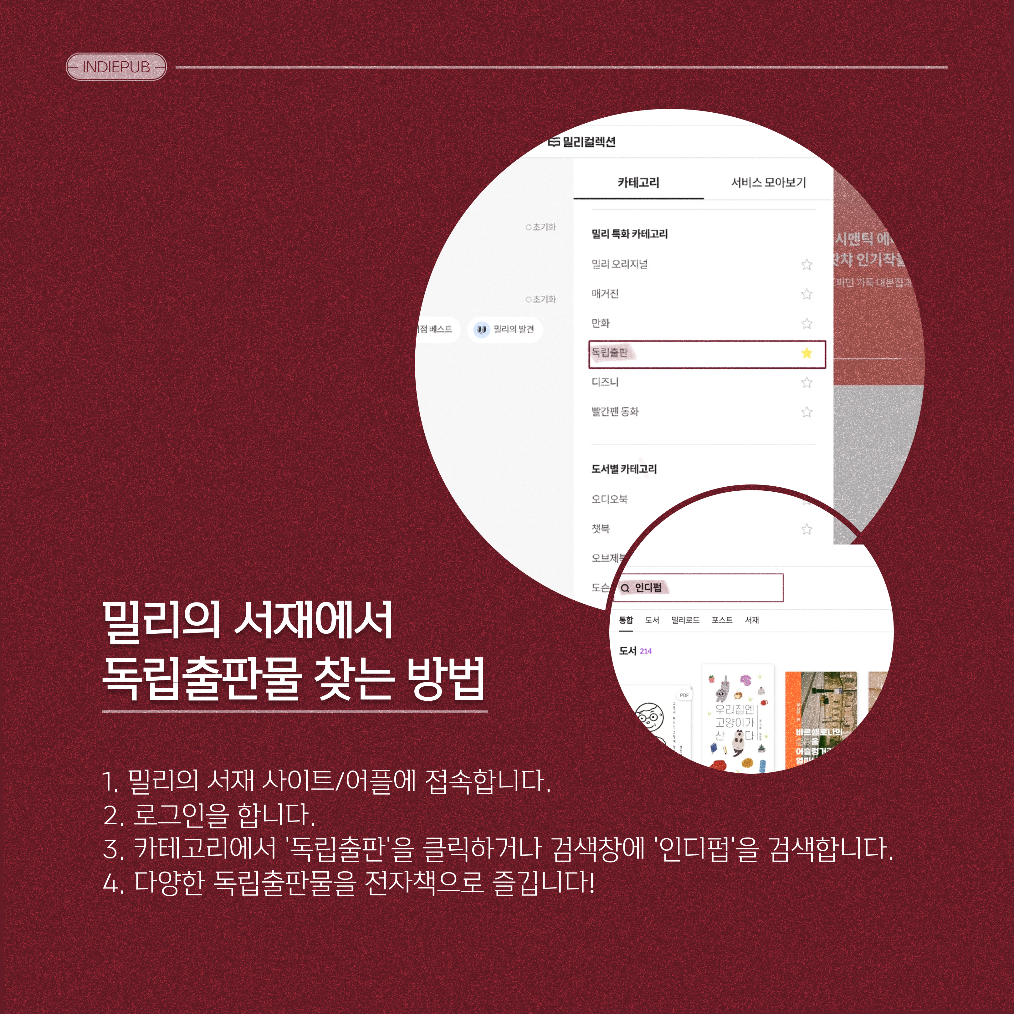 이제는 독립출판물도 밀리의 서재에서 쉽게 찾을 수 있어, 보다 많은 독립출판물들을 손쉽게 접할 수 있다는 점이 무척 만족스럽습니다. 독립출판물을 처음 접해보려는 분들이라면 밀리의 서재에서 다양한 독립출판물을 전자책으로 만나보는 것을 강력히 추천드립니다.