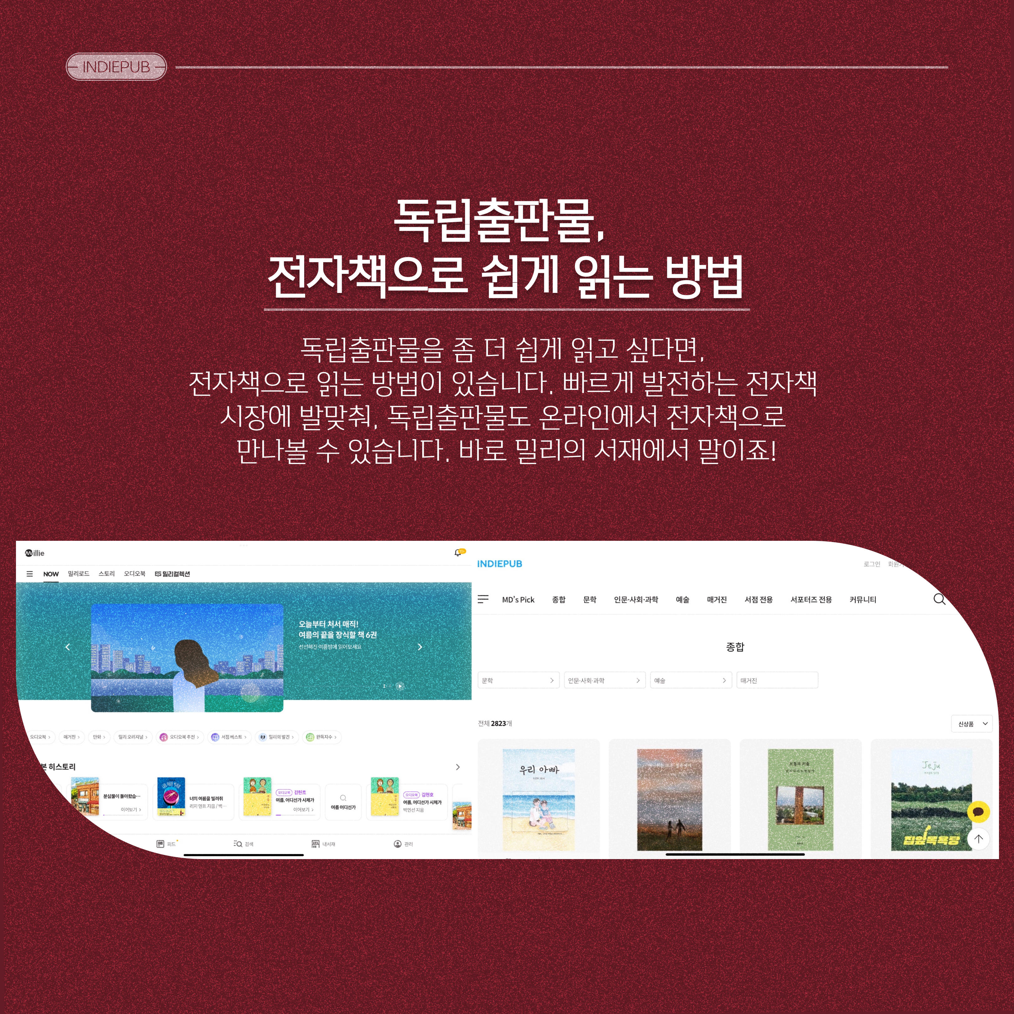 독립출판물을 좀 더 쉽게 읽고 싶다면, 전자책으로 읽는 방법이 있습니다. 빠르게 발전하는 전자책 시장에 발맞춰, 독립출판물도 온라인에서 전자책으로 만나볼 수 있게 되었습니다. 바로 밀리의 서재에서 말이죠!