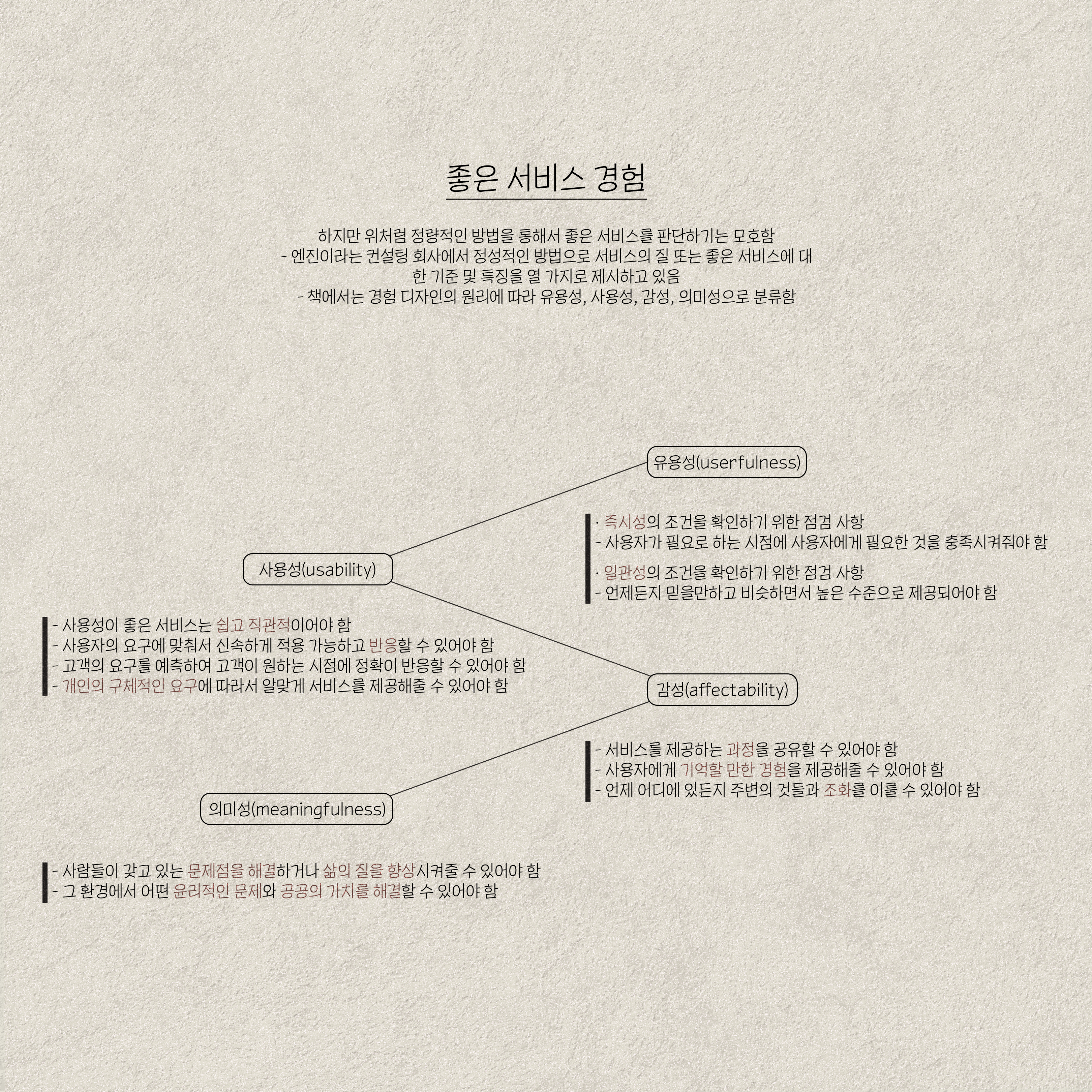 과거에는 좋은 서비스에 대한 양적 판단 기준으로 서브퀄을 사용했습니다. 하지만 이 기준은 복잡한 알고리즘을 거쳐야 하며 이런 정량적인 방법을 통해 좋은 서비스를 판단하기에는 모호합니다. 엔진이라는 컨설팅 회사에서는 더 정성적인 방법으로 서비스의 질 또는 좋은 서비스에 대한 기준 및 특징을 열 가지로 제시하고 있는데, 이 책에서는 경험 디자인의 원리에 따라서 유용성, 사용성, 감성, 의미성으로 분류하였습니다. 이 요소들을 만족하는 서비스를 제공했을 때, 사용자와 제공자 모두에게 진정한 경험을 줄 수 있을 것입니다.