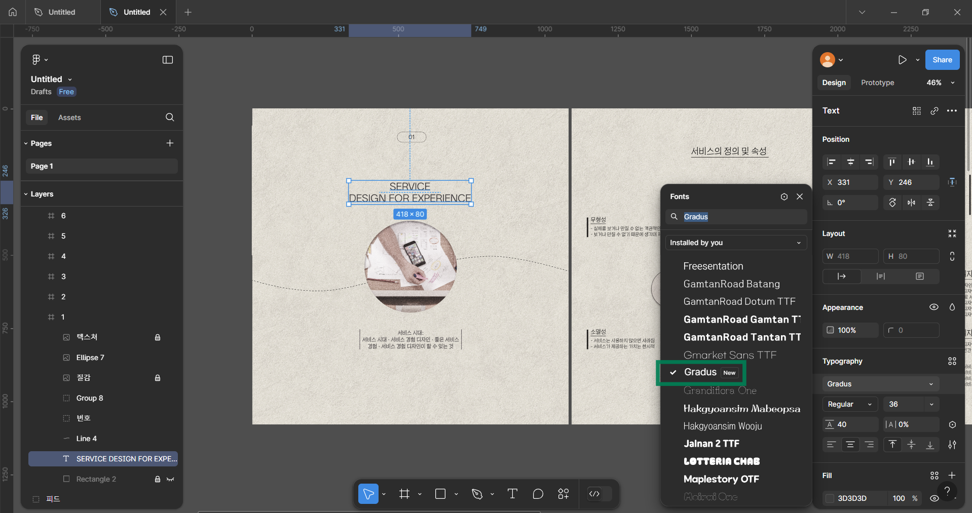 활용 예시입니다! 폰트가 자동으로 활성화되어서 타이틀이나 본문에 활용한 모습을 볼 수 있습니다. (사용된 폰트: Gradus