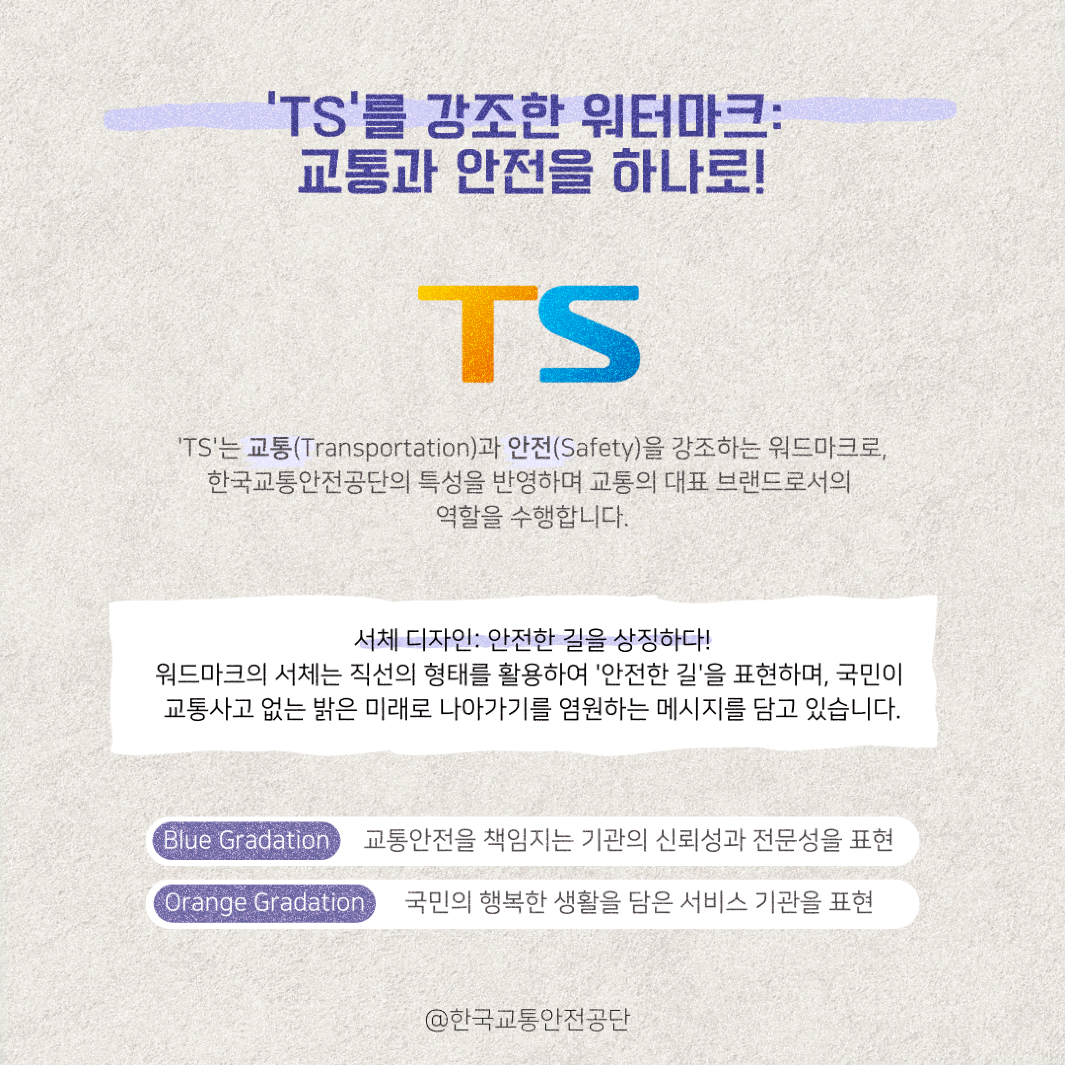 TS 워드마크: TS는 ‘Transportation’(교통)과 ‘Safety’(안전)를 강조하는 로고입니다. 한국교통안전공단을 떠올릴 수 있는 상징입니다.