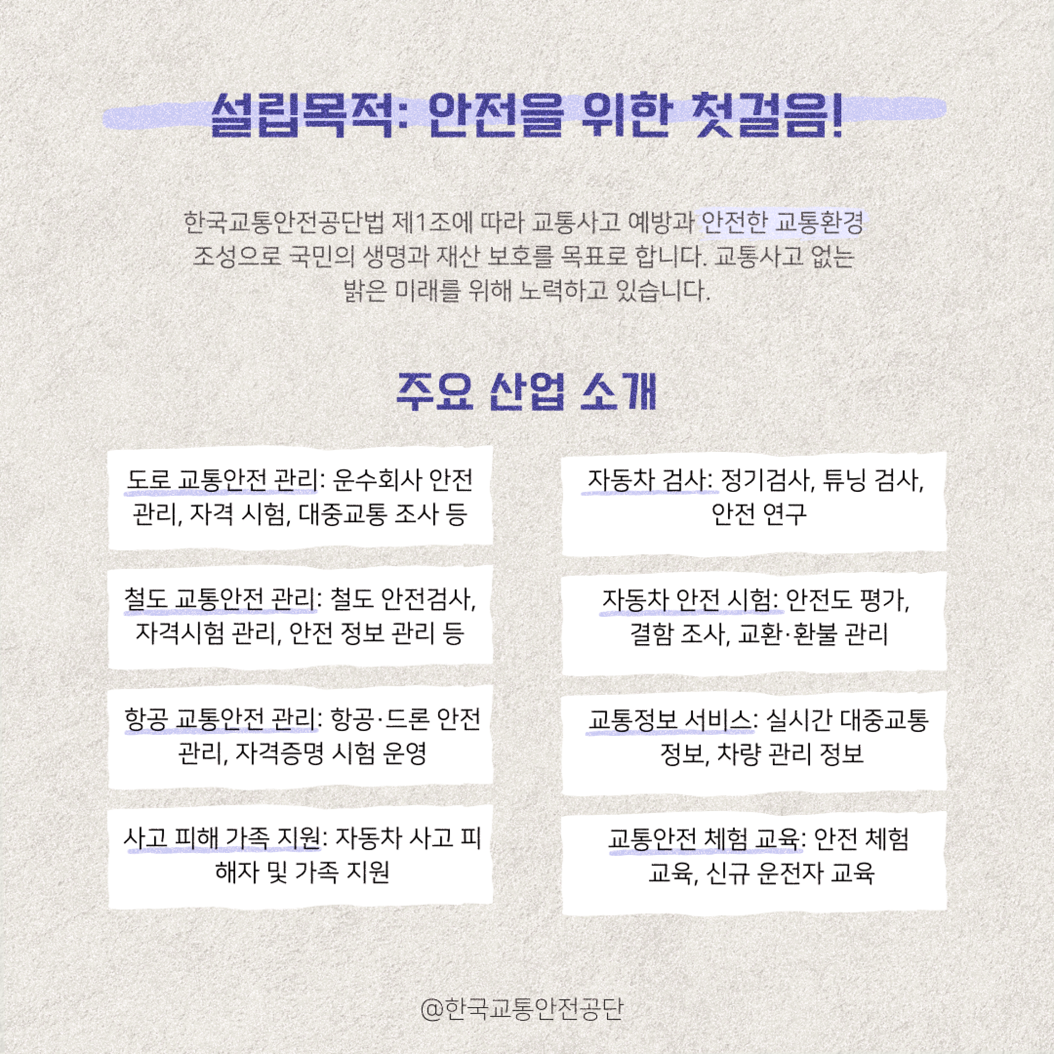 한국교통안전공단은 교통사고 없는 사회를 만들기 위해 다양한 사업을 펼치고 있습니다. 사람과 사람, 도시와 도시를 잇는 길을 더 안전하게 만들고자 오늘도 열심히 일하고 있죠!