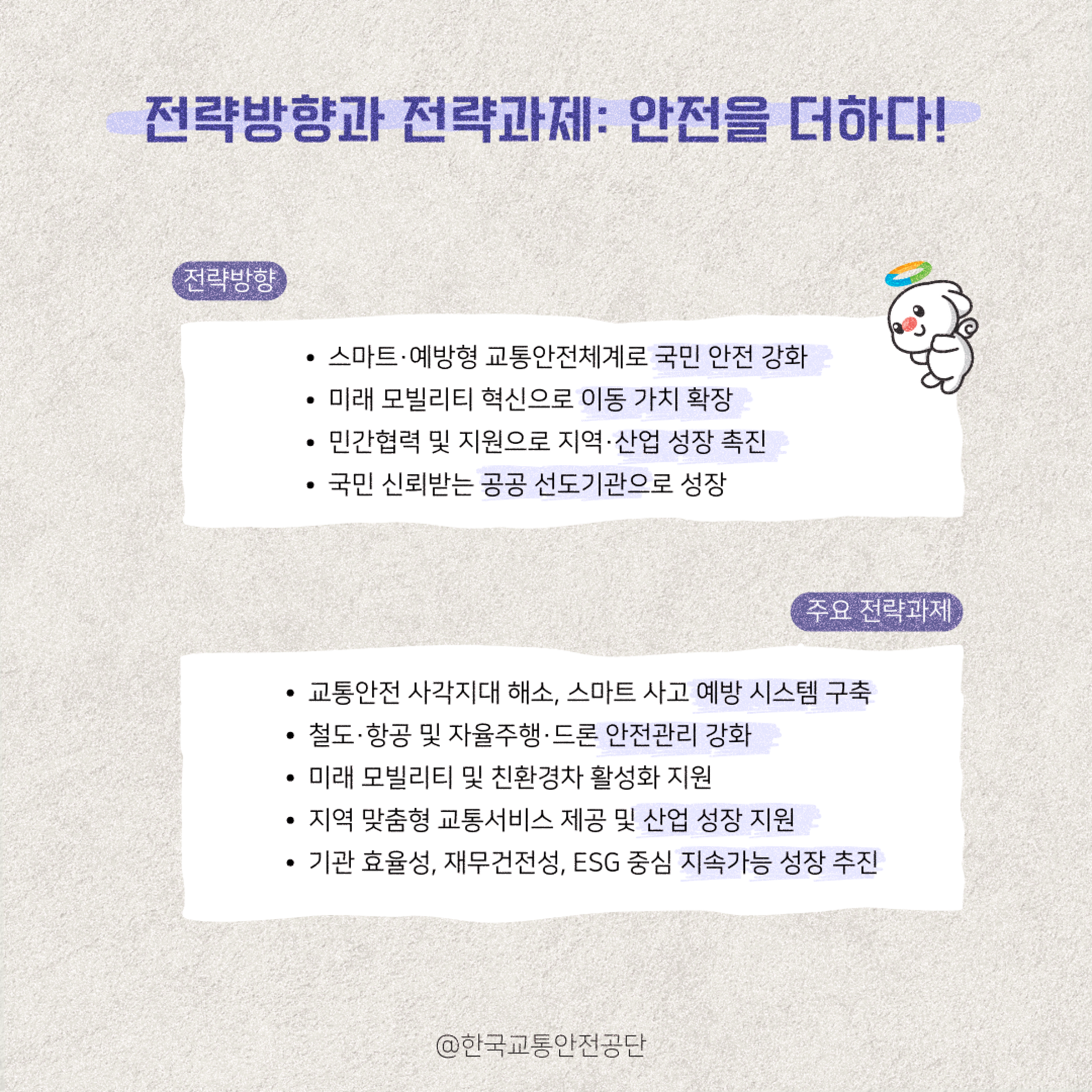 · 핵심가치: 공단은 안전, 공익, 책임, 혁신을 핵심 가치로 하여 교통 안전성 향상과 함께 공공기관으로서의 책임을 다합니다.
