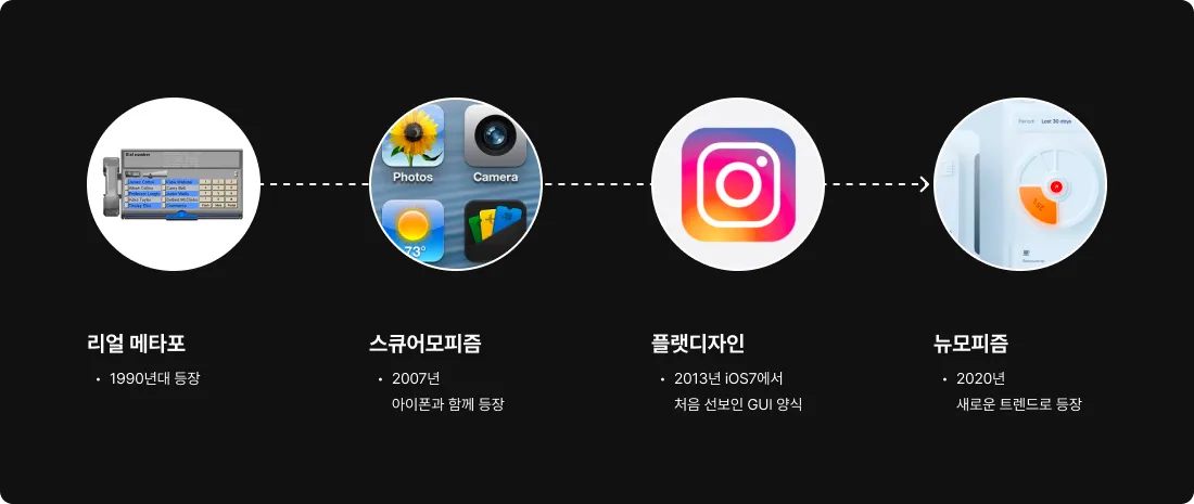 - 뉴모피즘: 2020년부터 스큐어모피즘과 플랫디자인의 장점을 결합한 디자인 트렌드로 떠오르고 있는 양식 중 하나다.