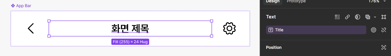 - 타이틀 누르고 리사이징 값을 전체를 채우도록 ▶️ w를 fill로 변경, 텍스트 가운데 정렬