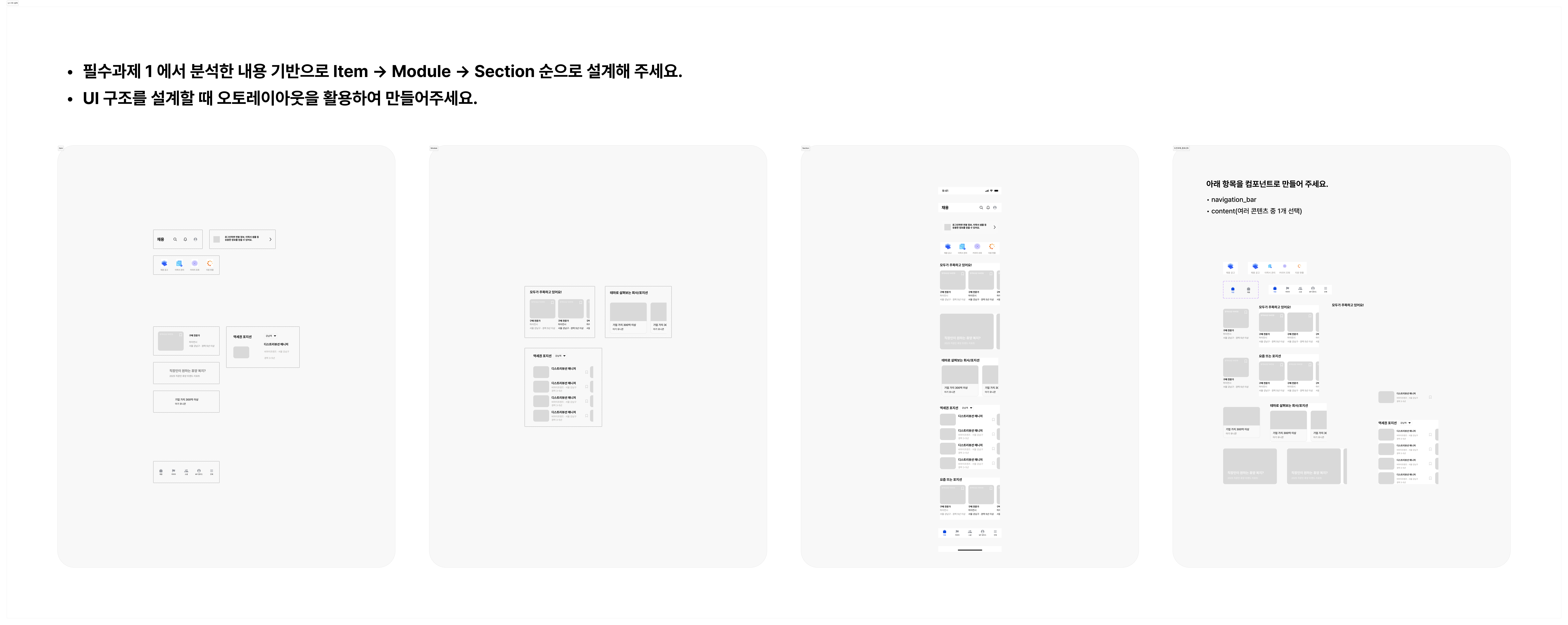 - UI 구조를 설계하면서 아이템 → 모듈 → 섹션 순으로 정리해야 한다고 배웠지만 실제 작업할 땐 모듈부터 만들고, 그 안에서 아이템을 하나씩 뽑아 정리하는 경우가 많았다. 왜 그럴까 생각해보니 아이템부터 정리하면 그 아이템이 어느 모듈에 속해 있는지 다시 찾아야 해서 작업 흐름이 번거롭게 느껴졌던 것 같다. 반면에 모듈을 먼저 한 번에 정리한 뒤 그 안에서 아이템을 분리하면 맥락이 명확해서 훨씬 효율적으로 느껴졌다. 이게 일반적인 접근인지 내 방식에 어떤 문제가 있었던 건지는 피드백 시간에 여쭤봐야겠다..🫠🫠