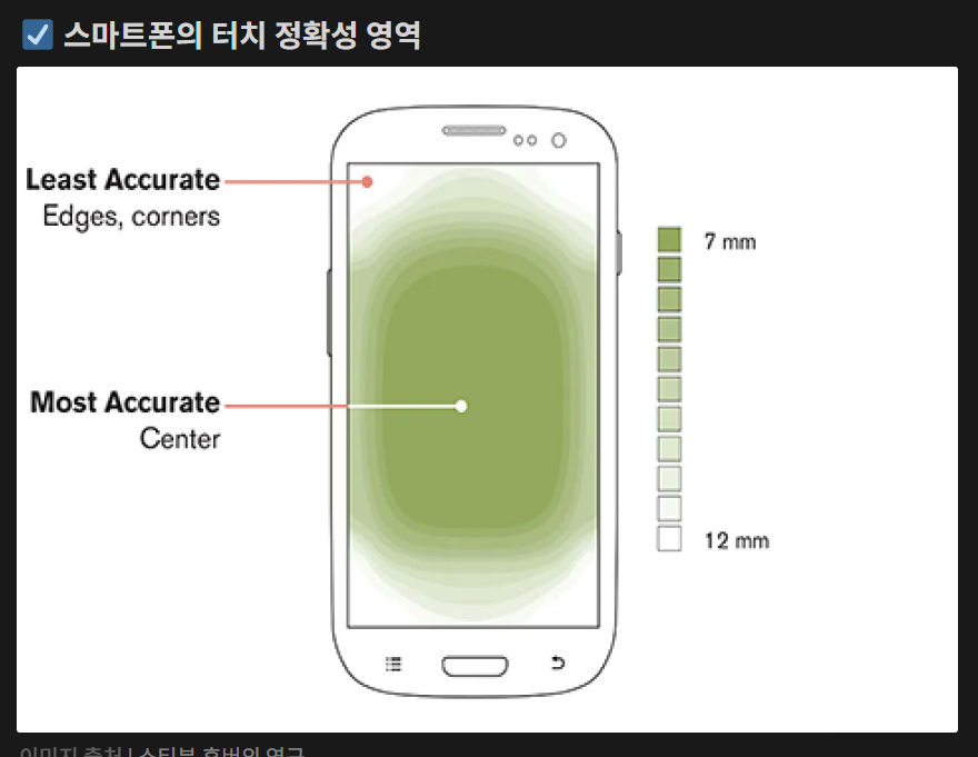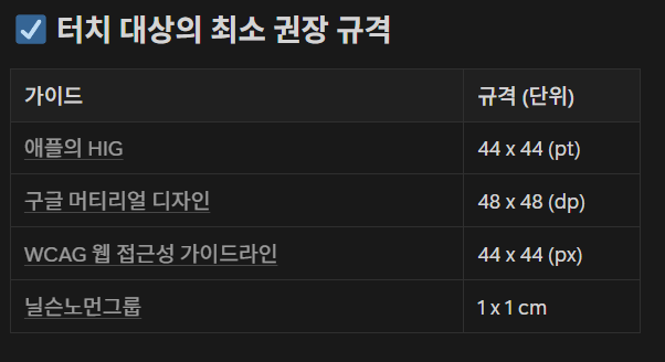 터치해야 하는 대상의 크기 ▶️ 사용자가 정확하게 선택할 수 있을 만큼 충분히 커야 함