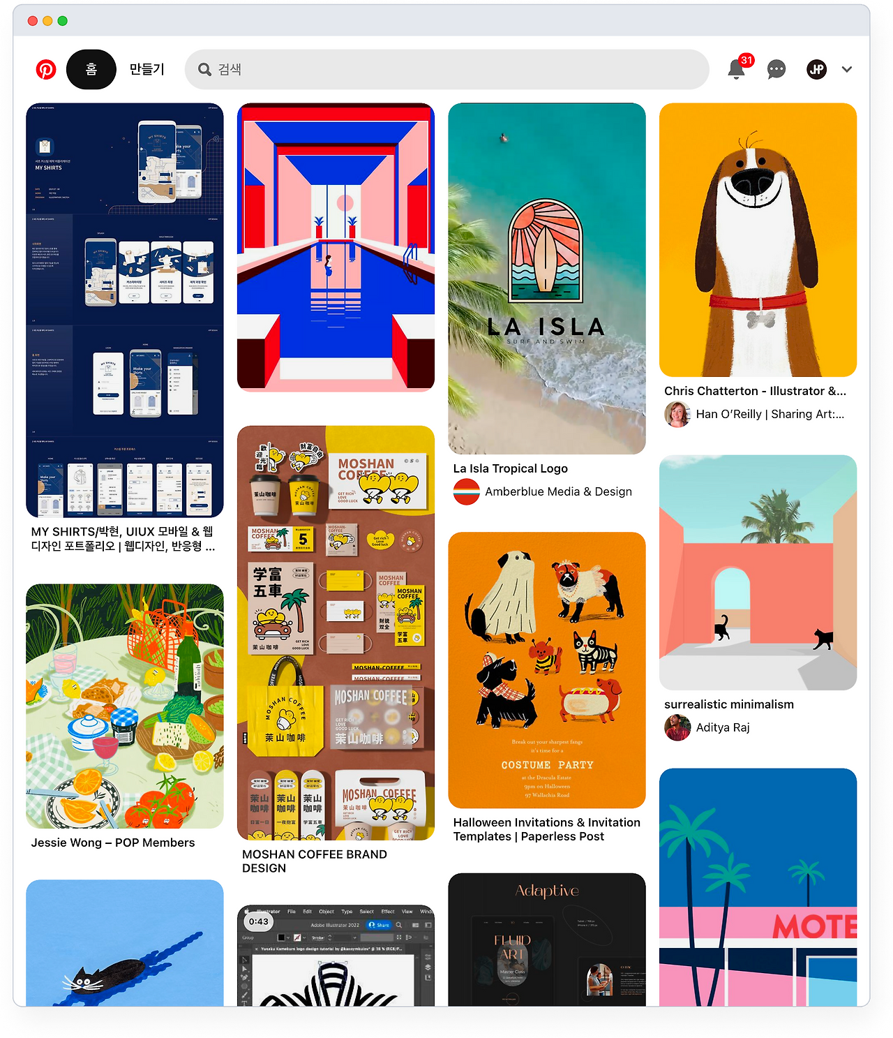 연속성의 원리: 연속적으로 직선이나 곡선을 이루는 요소를 잘 인지하는 경향 출처: UXUI 디자인 입문(챕터5-1)이미지의 크기가 모두 다르지만, 수직선을 만드는 열로 배열되어 있음 ▶️ 연속된 세로의 수직 레이아웃으로 인해 사용자는 편안함을 느낌 ▶️ 왜 익숙함을 느끼는가? 직선, 곡선으로 이어지는 것에 익숙함을 느끼기 때문
