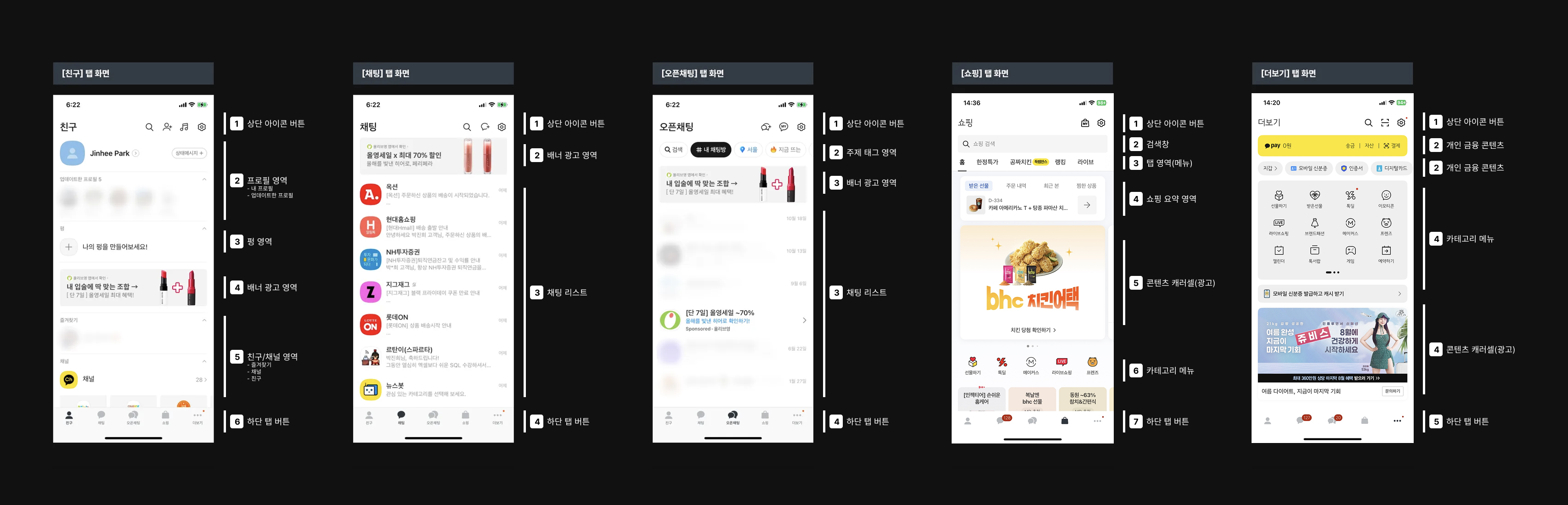 - 카카오톡에서 5개의 메인 탭(친구, 채팅, 오픈채팅, 쇼핑, 더보기) 화면의 구조 나눠보기