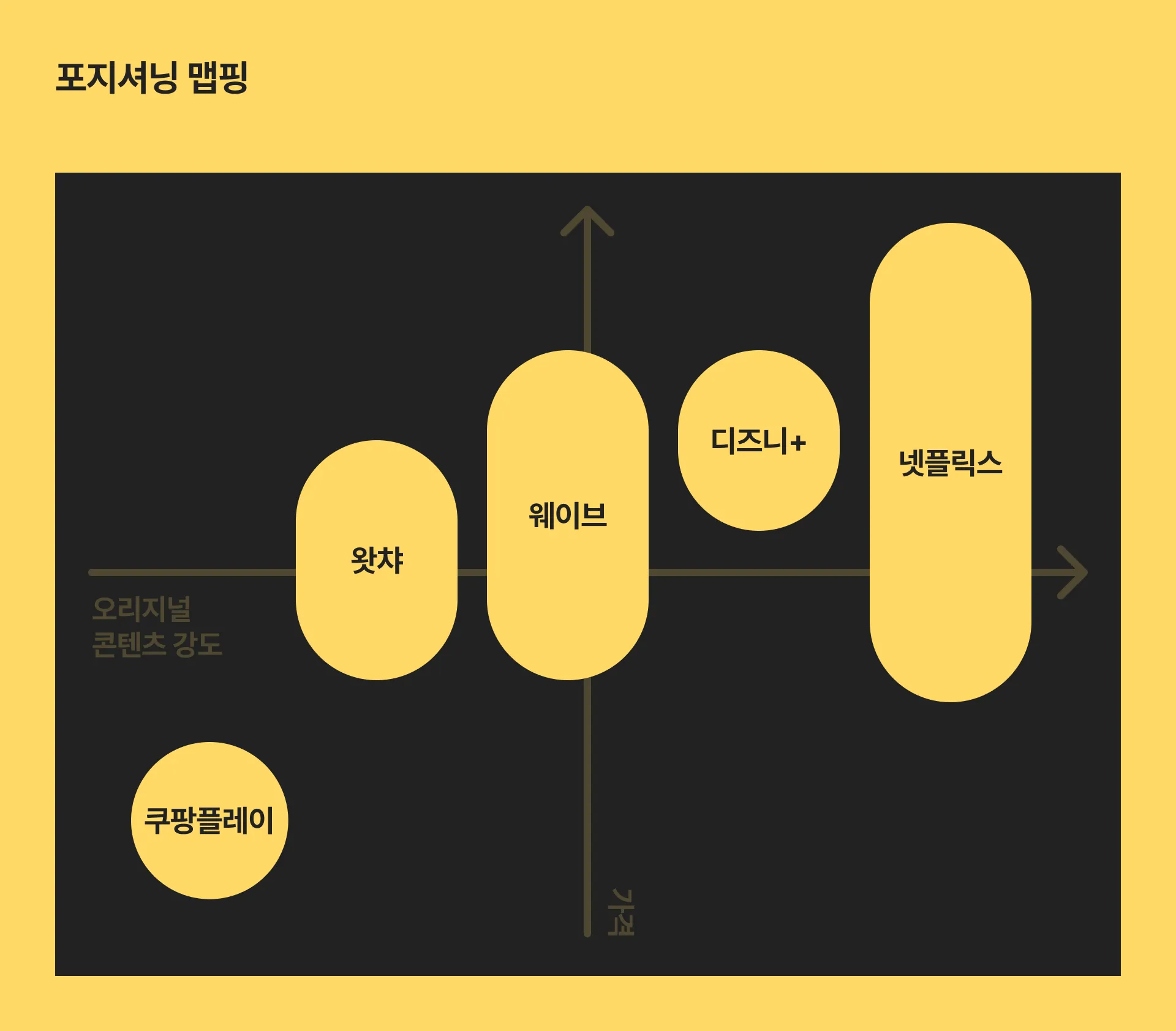 - X축에는 오리지널 콘텐츠 강도, Y축에는 가격을 두고 OTT 서비스 5개 직접 경쟁사의 위치 맵핑