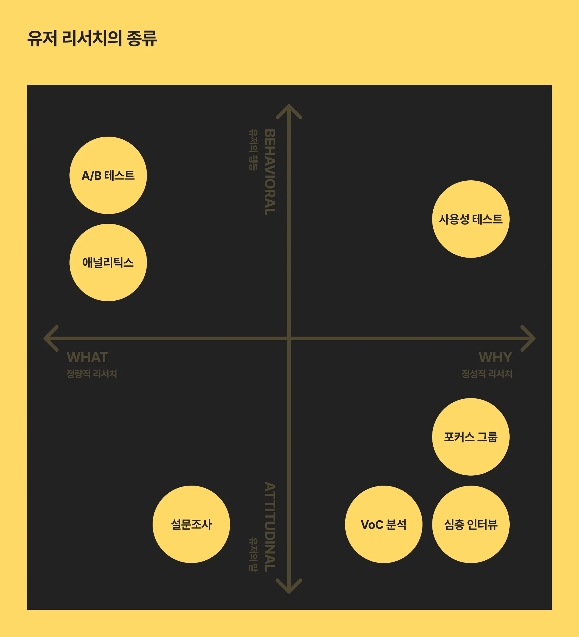 - 정성적 리서치: 사용성 테스트, 포커스 그룹, Voc 분석, 심층 인터뷰