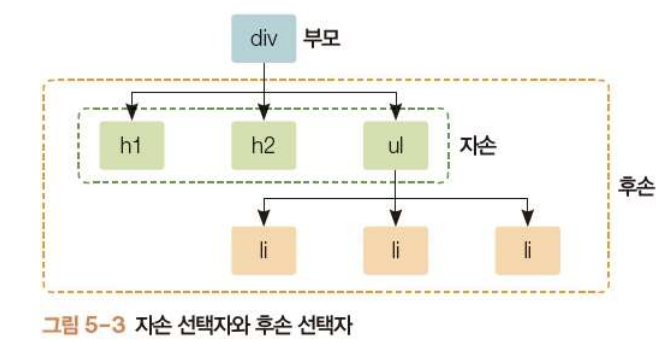 - 자손: div 태그를 기준으로 바로 한 단계 아래에 위치한 h1, h2, ul 태그